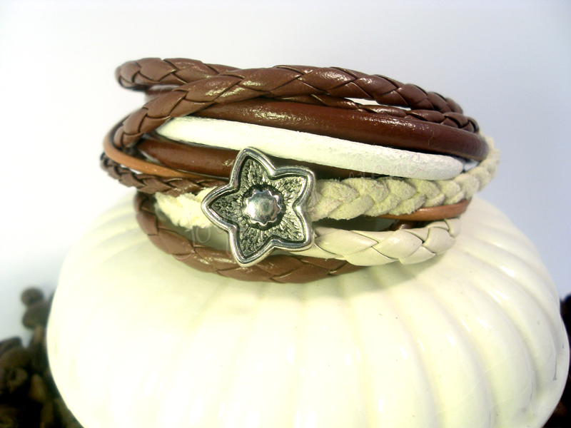 Typowa kawka z mlekiem. Plecione brązowe rzemienie w towarzystwie beżu i bieli. Takie kawowe szaleństwo okraszone jest rzeźbioną przekładką-kwiatkiem. Długość ok. 17 cm plus regulacja.